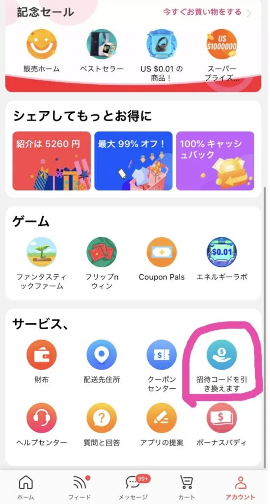 入力する場所はアカウント→招待コードを引き換えますの所でできます!